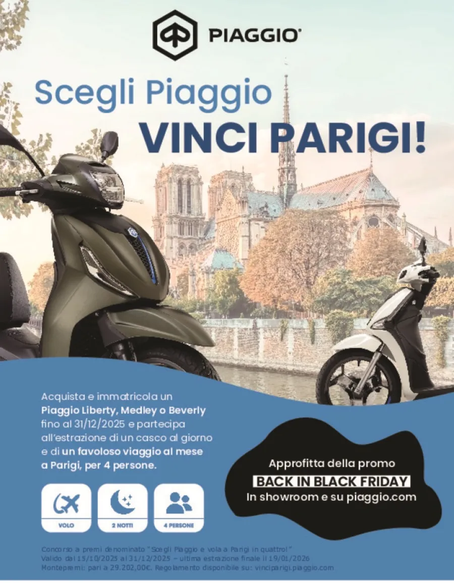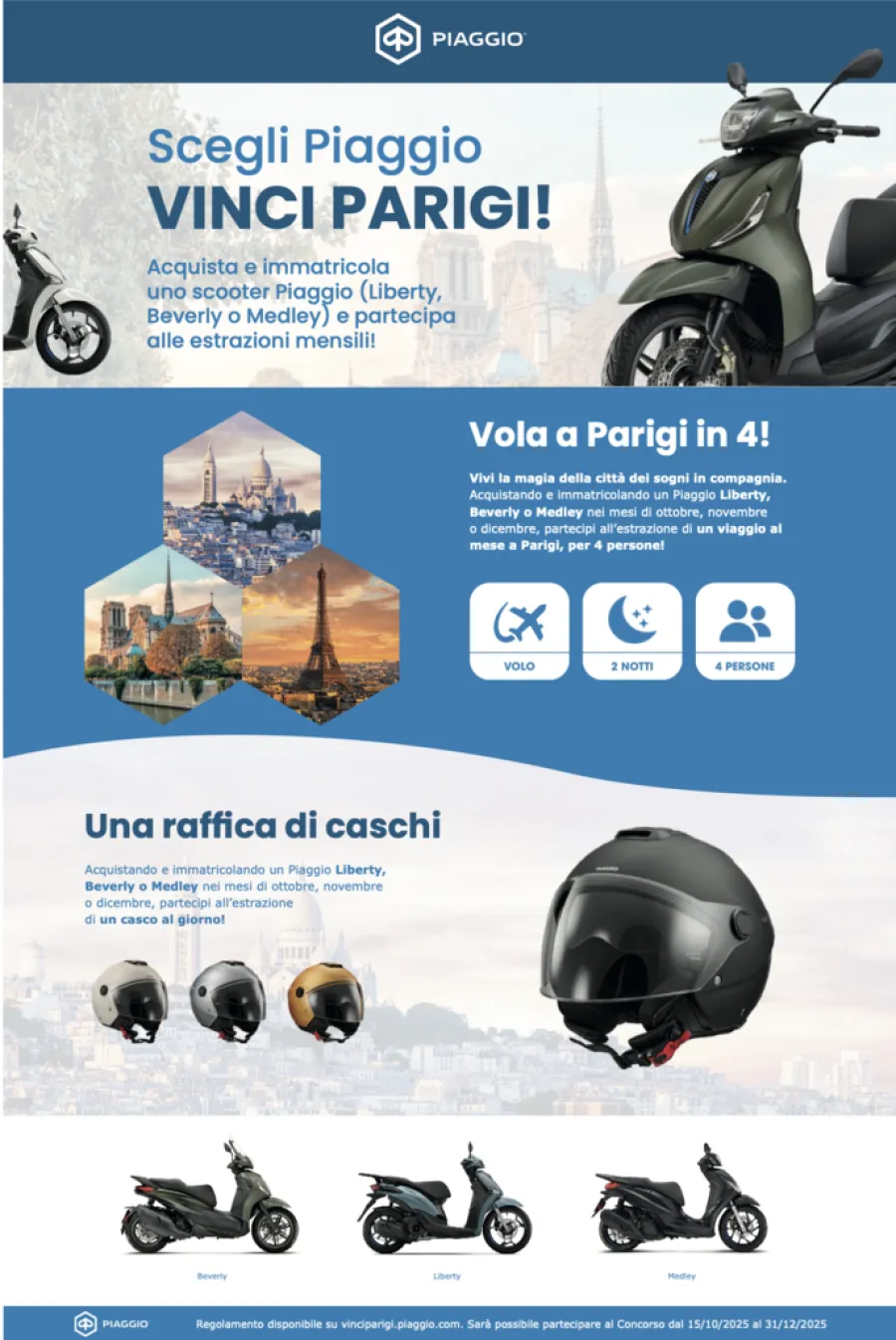 Concorso a premi denominato “Scegli Piaggio e vola a Parigi in quattro!” Valido dal 15/10/2025 al 31/12/2025 – ultima estrazione finale il 19/01/2026 Montepremi: pari a 29.202,00€. Regolamento disponibile su vinciparigi.piaggo.com