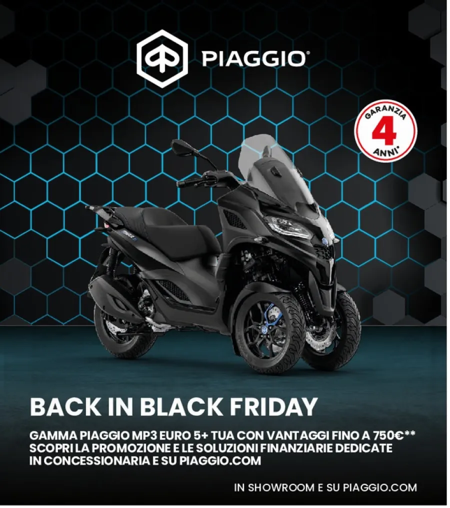 Offerta valida per veicoli immatricolati dal 01/12/2025 al 31/12/2025 sul prezzo di listino consigliato franco concessionario presso la rete di vendita ufficiale Piaggio che aderisce all’iniziativa. La promozione prevede 750€ di vantaggi su Mp4 400 e 530 Exclusive Euro 5+, 500€ su gamma Mp3 310 Euro 5+ riconosciuti attraverso varie possibilità, anche combinate tra loro, come ad esempio sconto sull’acquisto di accessori, abbuono delle spese di immatricolazione, assicurazione compresa nel prezzo f.c consigliato del veicolo, contributo sul prezzo f.c consigliato della gamma Mp3 Euro5+. Non cumulabile con eventuali ulteriori promozioni presenti dal concessionario.